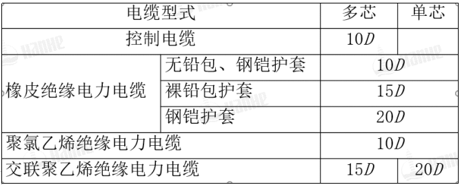 4.3敷設(shè)前檢查線路路徑,避免因路徑彎曲半徑過小造成護(hù)套開裂,XLPE絕緣電纜彎曲半徑不能小于電纜直徑的15倍(具體見下表)。