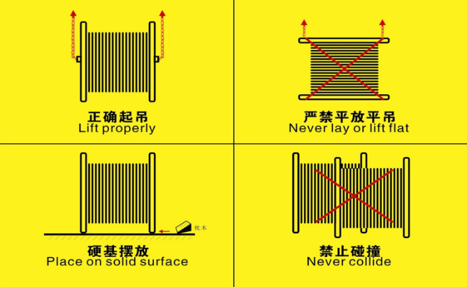 1.1. 電纜在運(yùn)輸、搬運(yùn)、存放及吊裝過程中,不得使電纜及電纜盤損傷;嚴(yán)禁將電纜盤直接由車上推下;電纜盤不應(yīng)平放運(yùn)輸、平放存儲及平放吊裝。